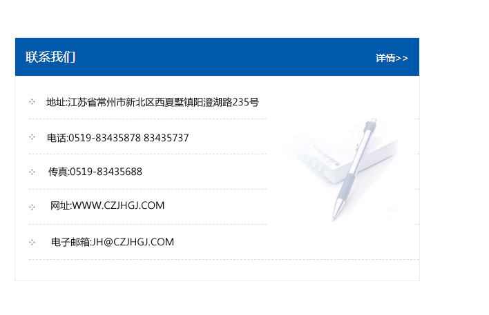 地址:常州市新北區友邦商務大廈1幢16、17層  電話:0519-85101652  傳真:0519-85112595  郵編:213022  網址:www_cz-jiayue_cn.cdmingchi.com  郵箱:xiajifengaa@163.com